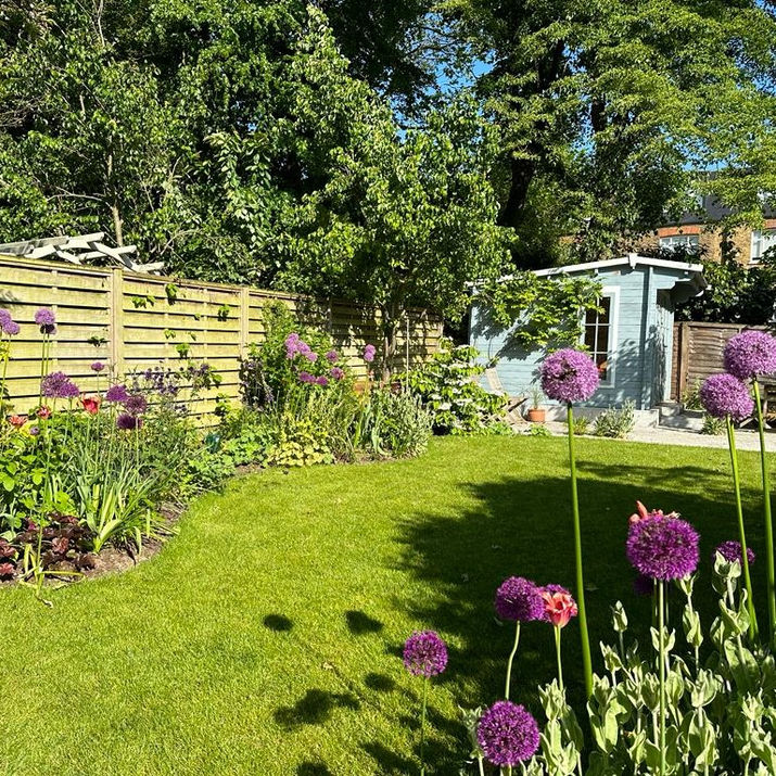 Planting wraps around and into seating areas and the stepping stone path meanders to echo the shape of the borders on either side of the lawn.