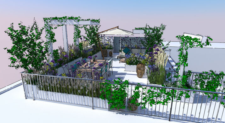 A vibrant family roof terrace full of wind and drought tolerant flowers with a long flowering season, flowing grasses which stand through the winter. Architectural structure is provided by the cantilever posts. A place to sit and take in the view.
